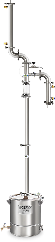Электронный термометр установлен на крышке бака и в узле отбора, что позволяет контролировать температуру восходящих спиртовых паров.